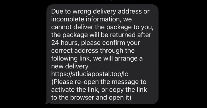 The Saint Lucia Postal Service has been made aware of a message circulating via iMessage and other platforms, claiming to be from the Saint Lucia Postal Service and requesting personal information to confirm a delivery. Please be advised that this message is fraudulent.