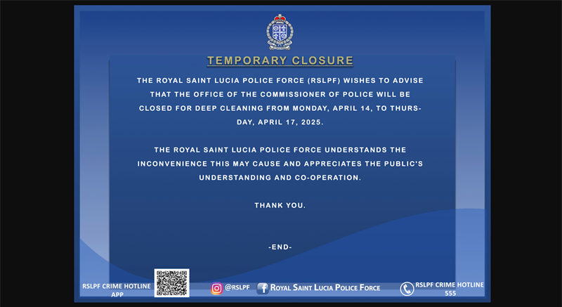 The Royal Saint Lucia Police Force (RSLPF) wishes to advise that the Office of the Commissioner of Police will be closed for deep cleaning from Monday, April 14 to Thursday, April 17.